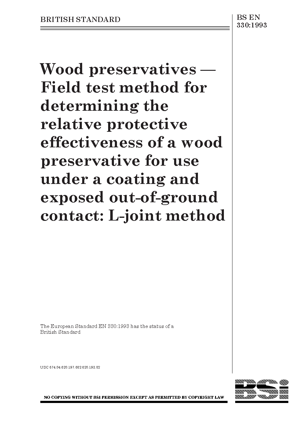 Wood preservatives. Determination of the relative protective effectiveness of a wood preservative for use under a coating and exposed out-of-ground contact. Field test: L-joint method