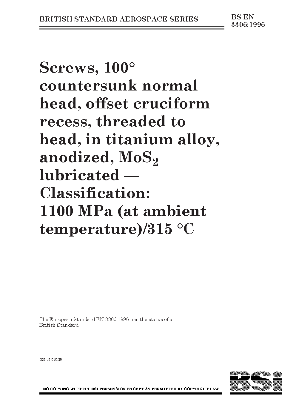 Screws, 100° countersunk normal head, offset cruciform recess, threaded to head, in titanium alloy, anodized, MoS2 lubricated. Classification. 1100 MPa (at ambient temperature)/315°C