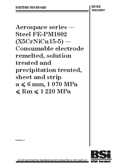 Heat treatment;Remelting;Dimensions;Proof stress;Chemical composition;Strips;Bending;Consumable electrodes;Air transport engineering;Tensile strength;Hardness;Precipitation hardening;Sheet materials;Solution heat treatment;Crystal microstructure;Elongation;Steels