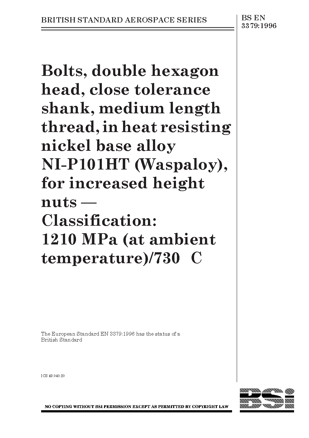 Bolts, double hexagon head, close tolerance shank, medium length thread, in heat resisting nickel base alloy NI-P101HT (Waspaloy), for increased height nuts. Classification: 1210 MPa (at ambient temperature)/730°C