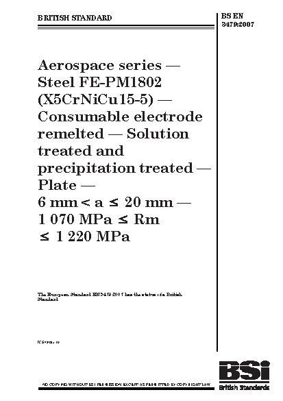 Aerospace series - Steel FE-PM1802 (X5CrNiCu15-5) - Consumable electrode remelted - Solution treated and precipitation treated - Plate - 6 mm < a = 20 mm - 1070 MPa = Rm = 1220 MPa