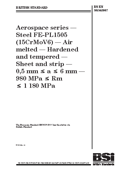 Aerospace series. Steel FE-PL1505 (15CrMoV6). Air melted. Hardened and tempered. Sheet and strip. 0,5 mm = a = 6 mm. 980 MPa = Rm = 1180 MPa