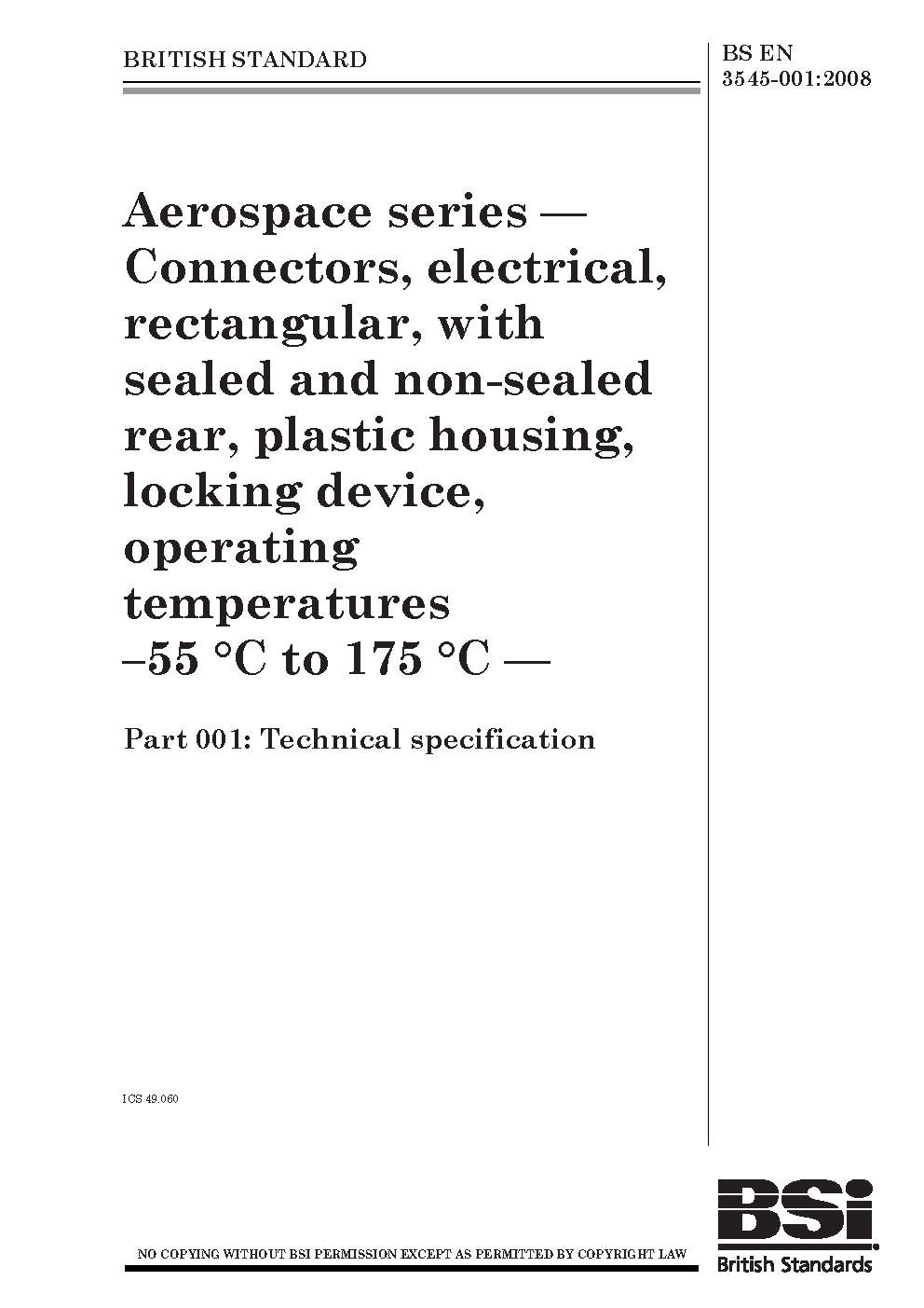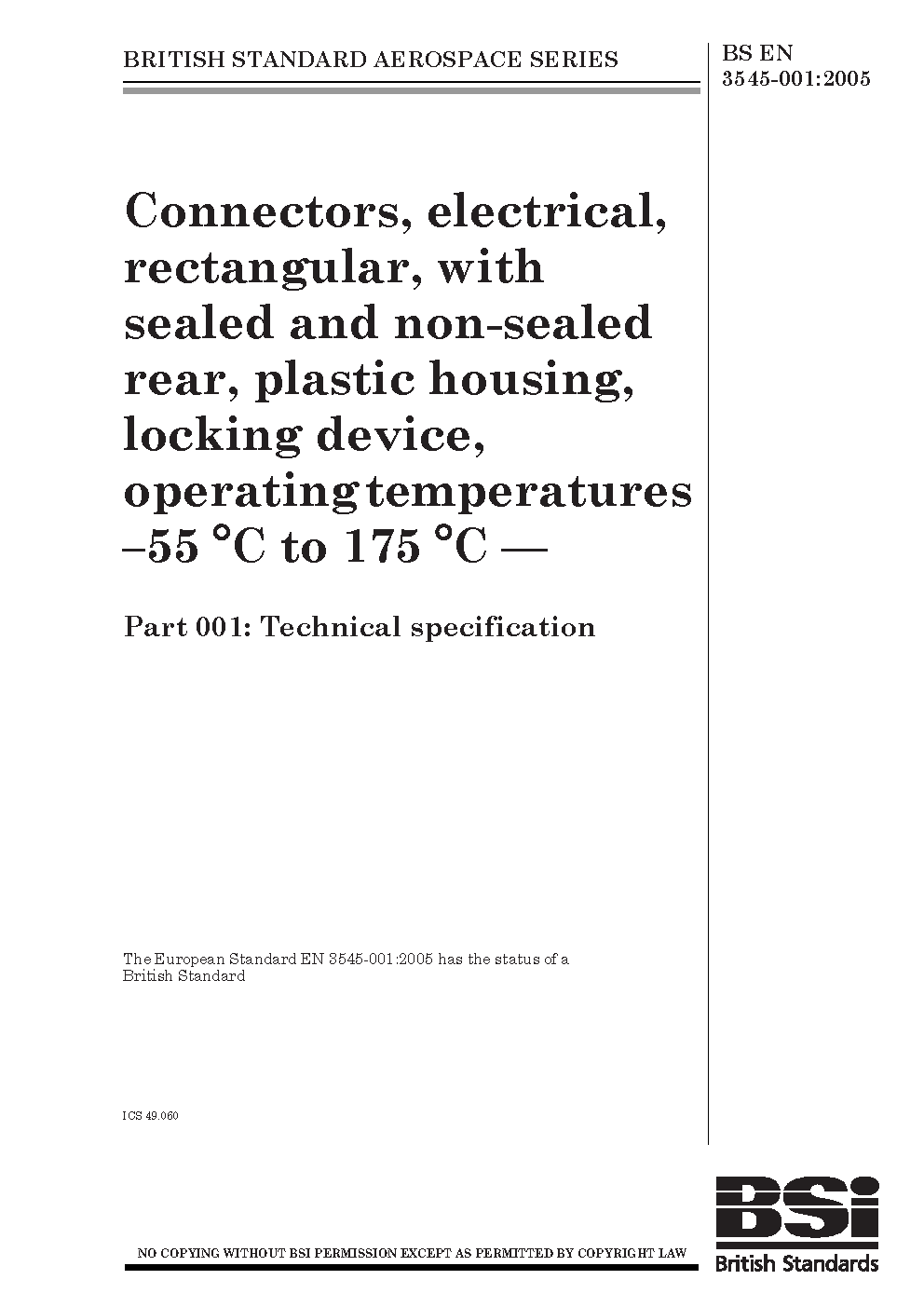 Aerospace series. Connectors, electrical, rectangular, with sealed and non-sealed rear, plastic housing, locking device, operating temperatures -5 °C to 175 Technical specification