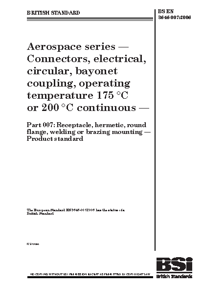 Aerospace series. Connectors, electrical, circular, bayonet coupling, operating temperature 175°C or 200°C continuous Receptacle, hermetic, round flange, welding brazing mounting. Product standard