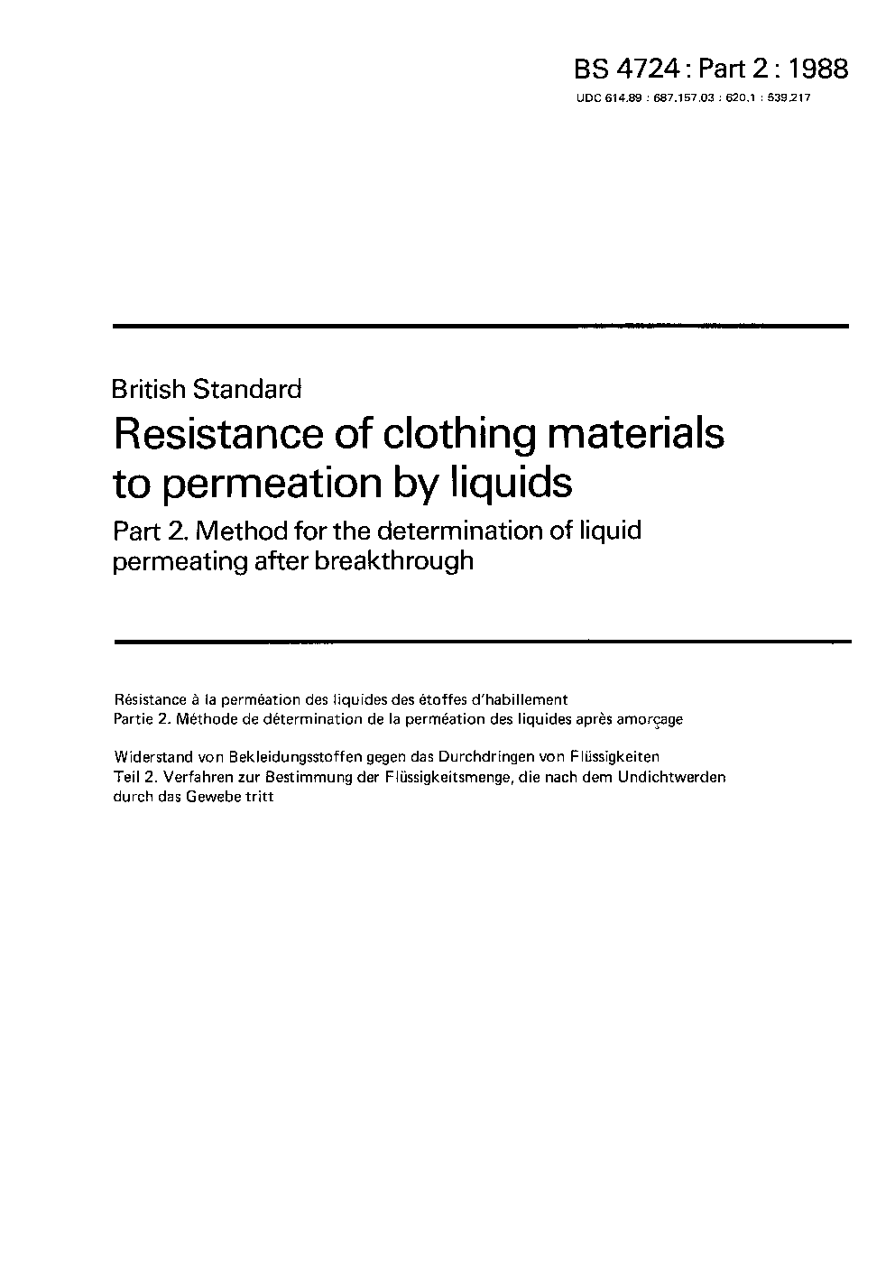Protective clothing. Protection against liquid chemicals. Test method. Resistance of materials to permeation by liquids