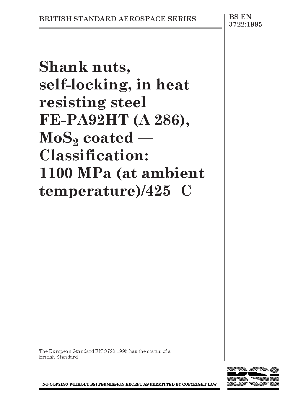Shank nuts, self-locking, in heat resisting steel FE-PA92HT (A 286), MoS2 coated. Classification: 1100 MPa (at ambient temperature)/425°C