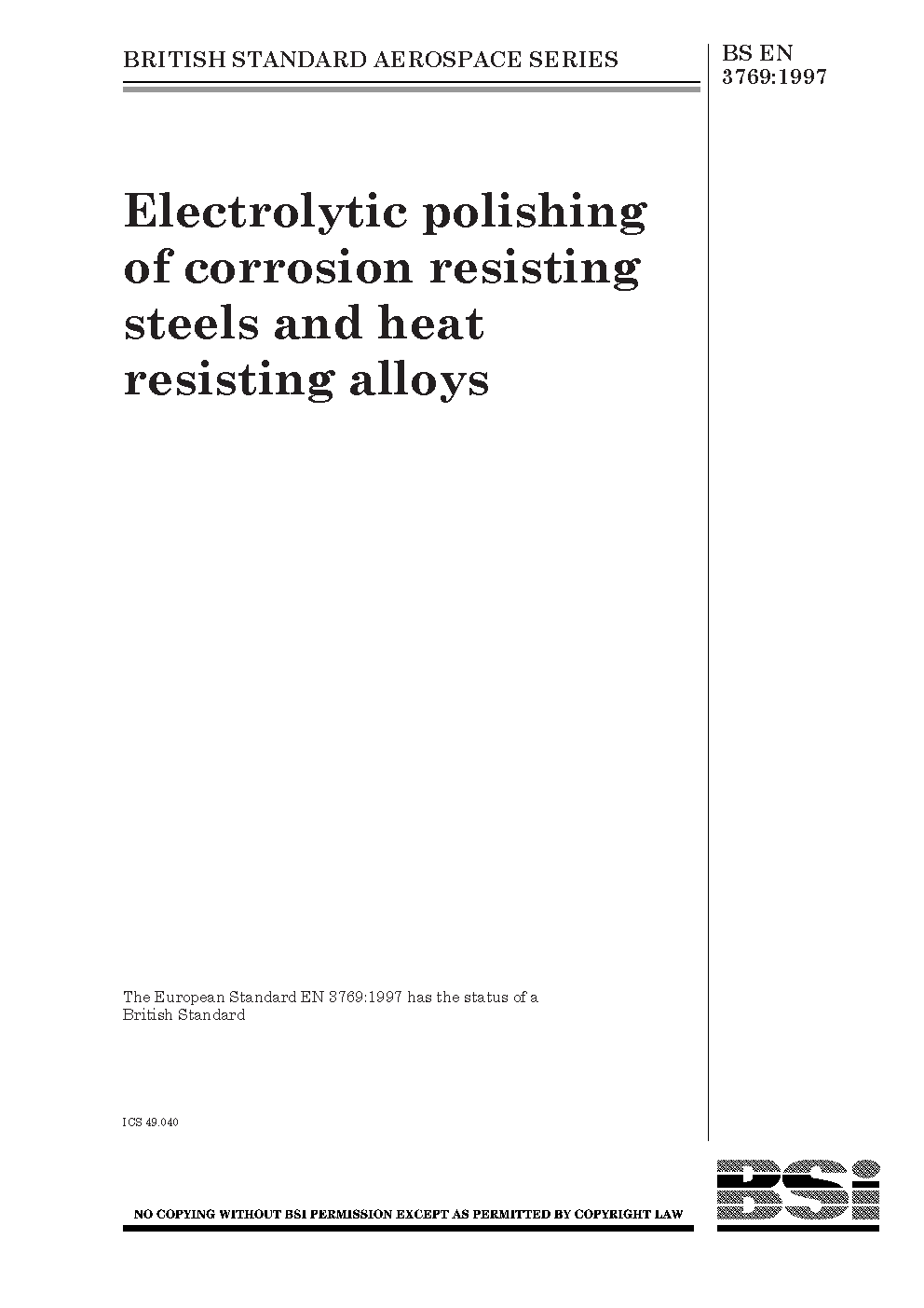 Corrosion-resistant materials;Acceptance (approval);Steels;Alloys;Electric current;Quality assurance;Air transport engineering;Inspection;Electropolishing;Voltage;Heat-resistant materials;Surface treatment;Polishing;Chemical composition;Designations;Corrosion-resistant steels
