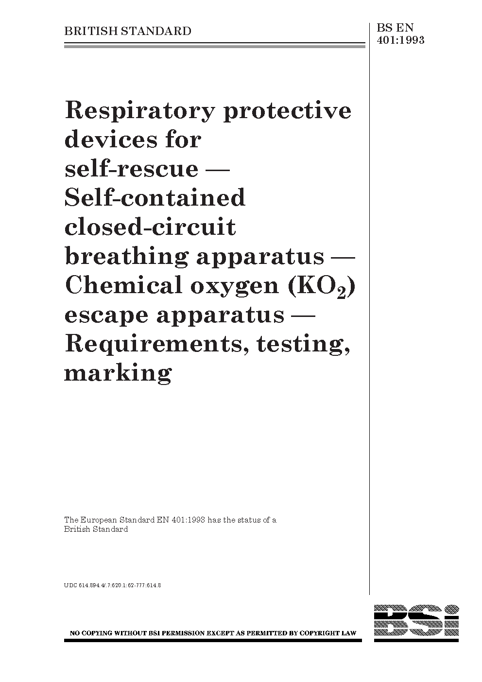 Respiratory protective devices for self-rescue. Self-contained closed-circuit breathing apparatus. Chemical oxygen (KO2) escape apparatus. Requirements, testing, marking