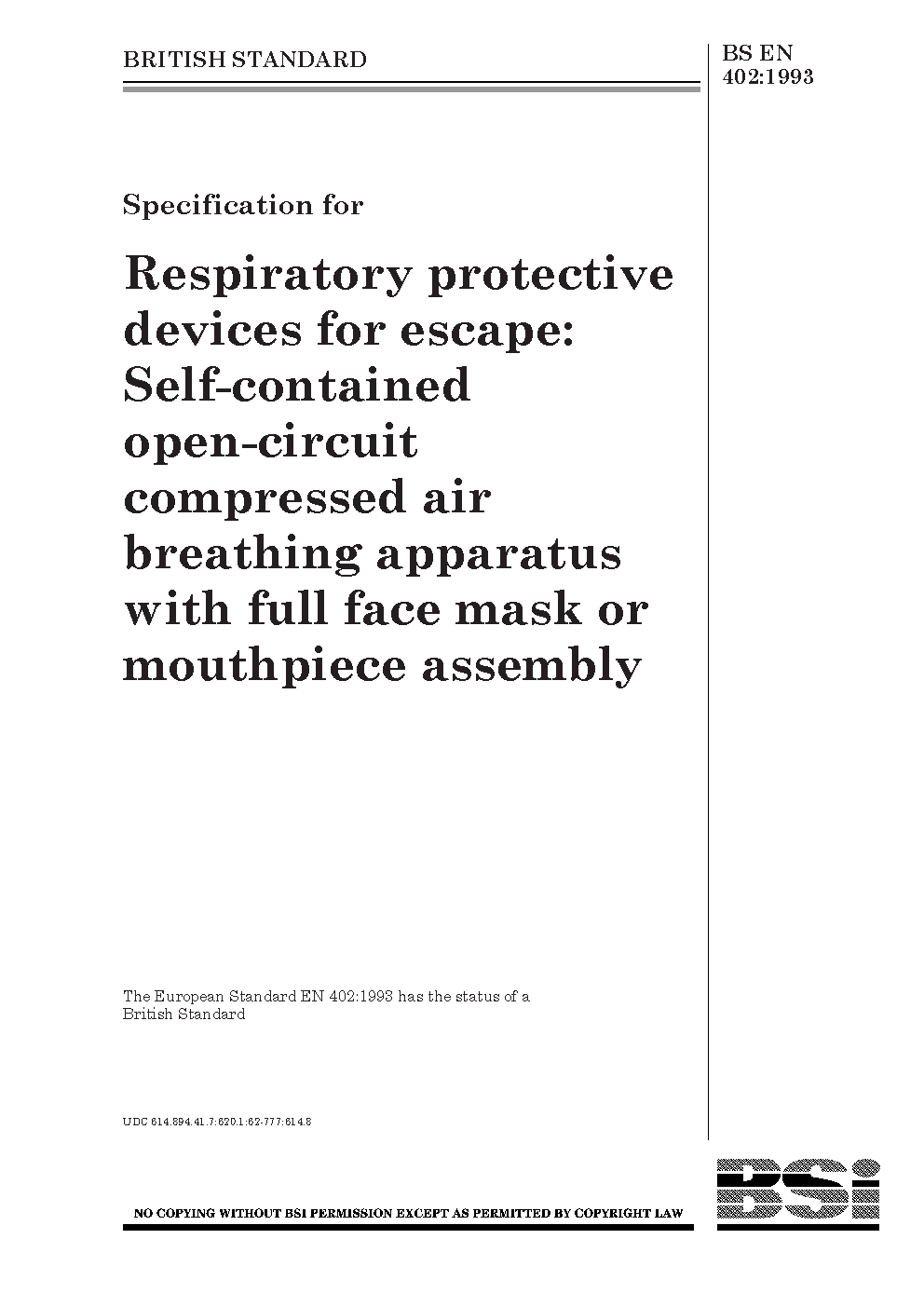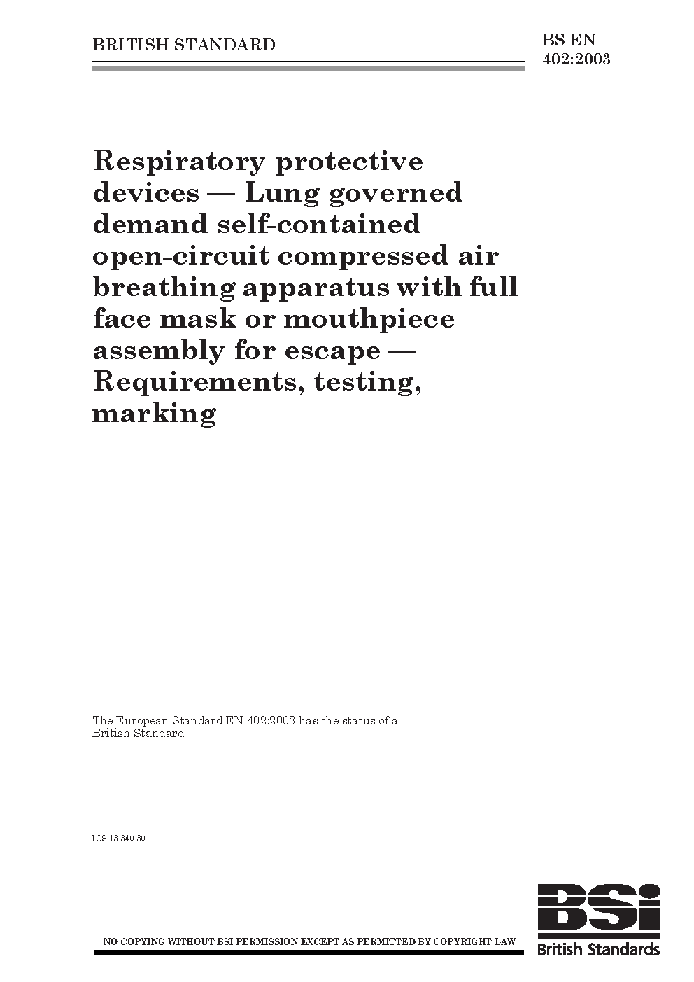 Specification for respiratory protective devices for escape. Self- contained open-circuit compressed air breathing apparatus withfull face mask or mouthpiece assembly