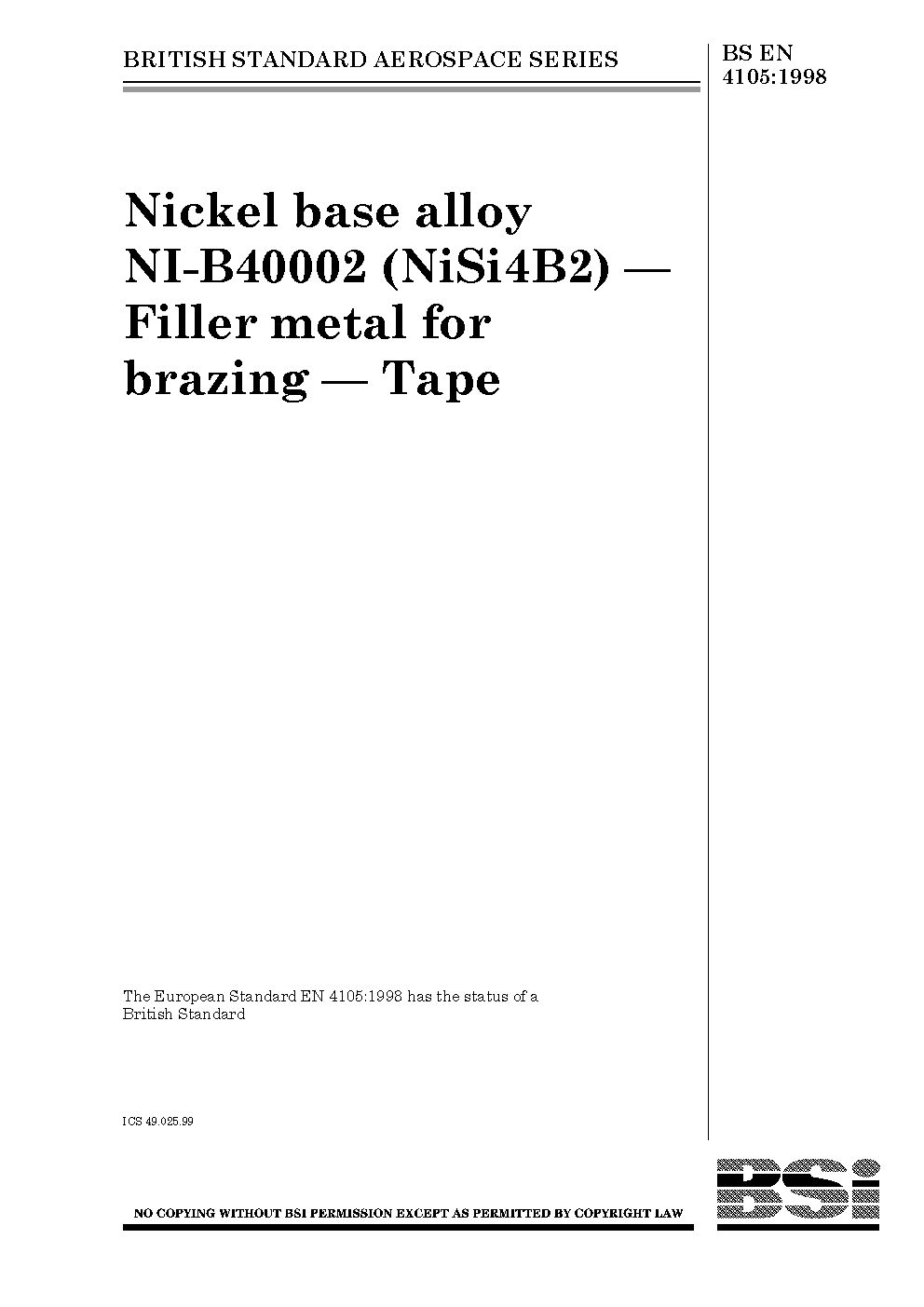 Nickel base alloy NI-B40002 (NiSi4B2). Filler metal for brazing. Tape