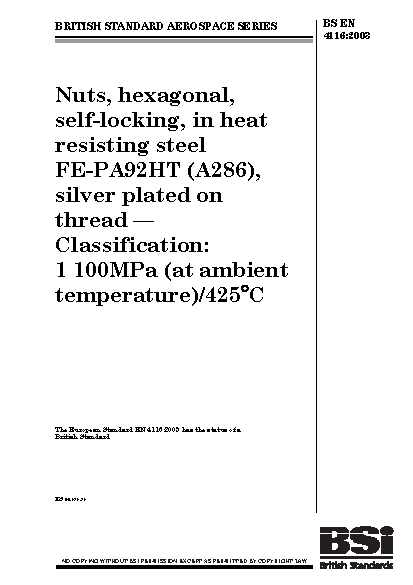 Aerospace series. Nuts, hexagonal, self-locking, in heat resisting steel FE-PA92HT (A286), silver plated on thread. Classification: 1100 MPa (at ambient temperature)/425°C