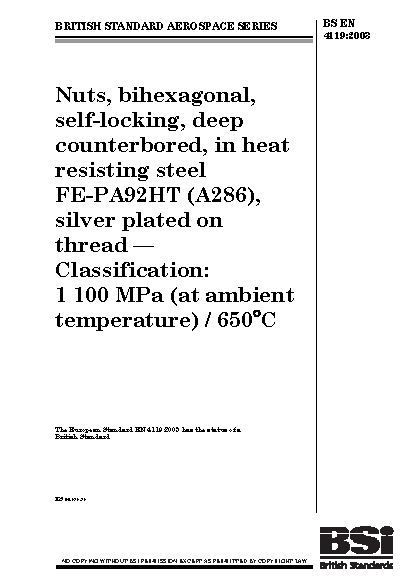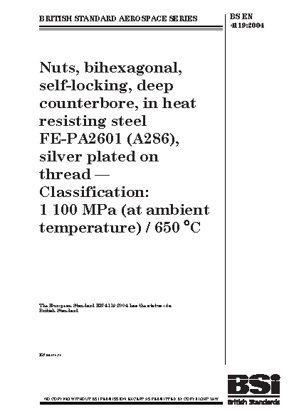 Aerospace series. Nuts, bihexagonal, self-locking, deep counterbored, in heat resisting steel FE-PA92HT (A286), silver plated on thread. Classification: 1100 MPa (at ambient temperature) / 650°C