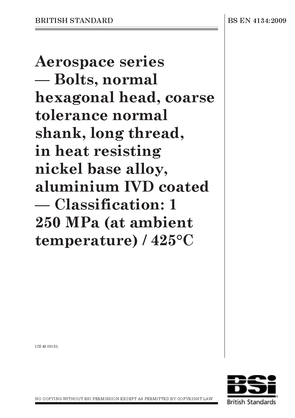 Dimensions;Aircraft components;Heat-resistant materials;Marking;Designations;Metal coatings;Threaded fasteners;Bolts;Fasteners;Aluminium;External-thread fasteners;Hexagonal-head fasteners;Weight (mass);Surface treatment;Nickel alloys