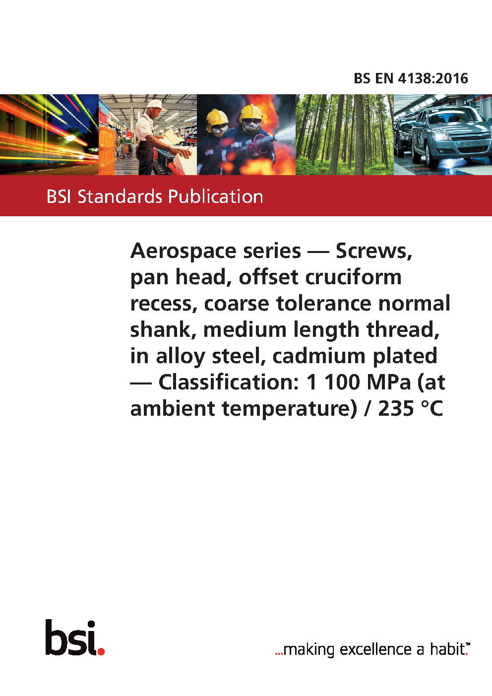 Aerospace series. Screws, pan head, offset cruciform recess, coarse tolerance normal shank, medium length thread, in alloy steel, cadmium plated. Classification: 1100 MPa (at ambient temperature) / 235°C