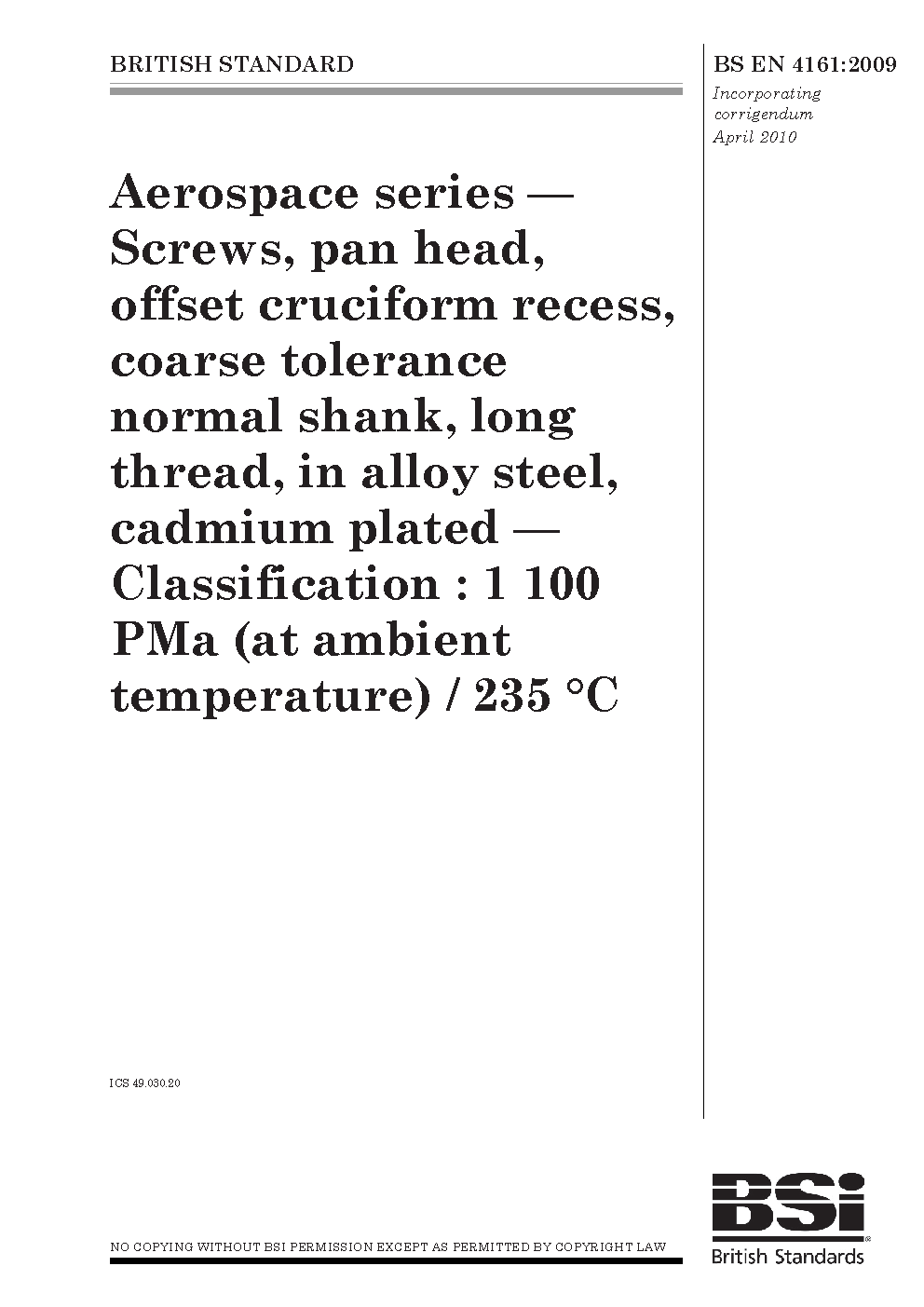 Aerospace series. Screws, pan head, offset cruciform recess, coarse tolerance normal shank, long thread, in alloy steel, cadmium plated. Classification: 1100 MPa (at ambient temperature) / 235 °C