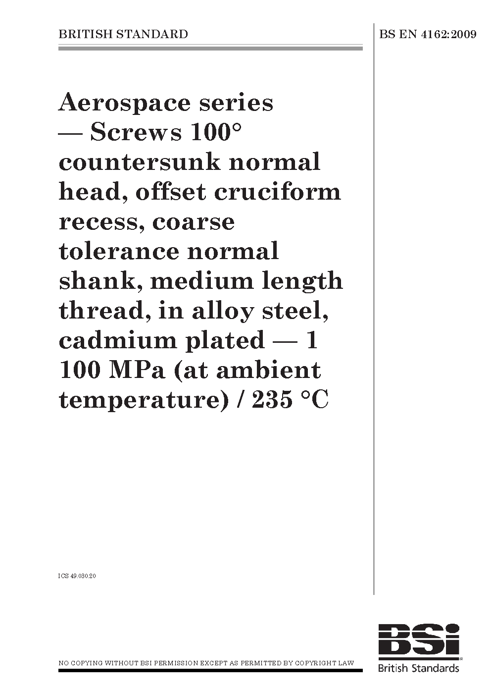 Aerospace series. Screws 100° countersunk normal head, offset cruciform recess, coarse tolerance shank, medium length thread, in alloy steel, cadmium plated. 1100 MPa (at ambient temperature) / 235°C EN 4162:2009