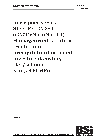 Proof stress;Investment casting;Castings;Tensile strength;Elongation;Precipitation hardening;Heat treatment;Solution heat treatment;Hardness;Dimensions;Chemical composition;Steels;Crystal microstructure;Air transport engineering;Homogeneous mixtures