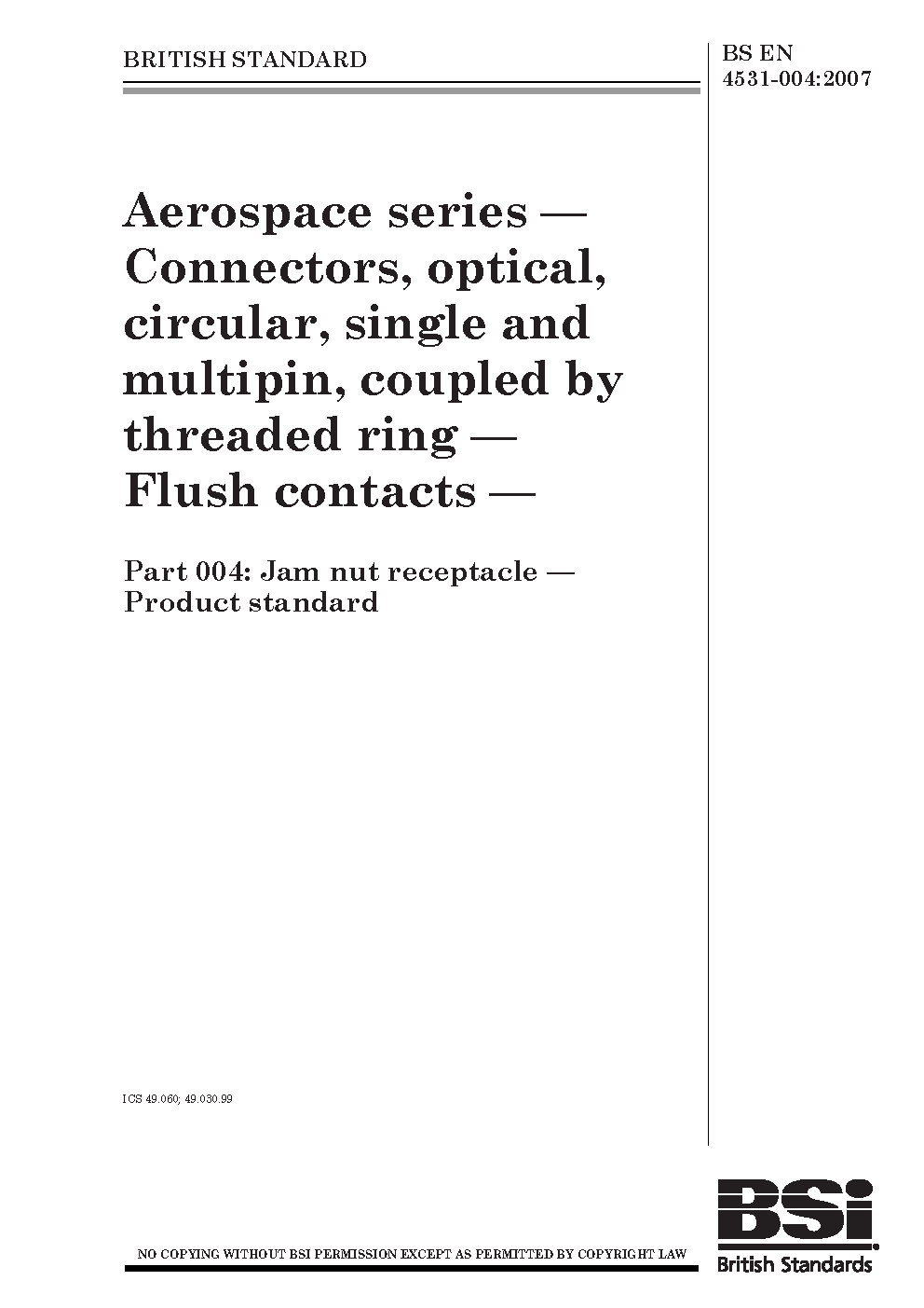 Aerospace series. Connectors, optical, circular, single and multipin, coupled by threaded ring. Flush contacts Jam nut receptacle. Product standard