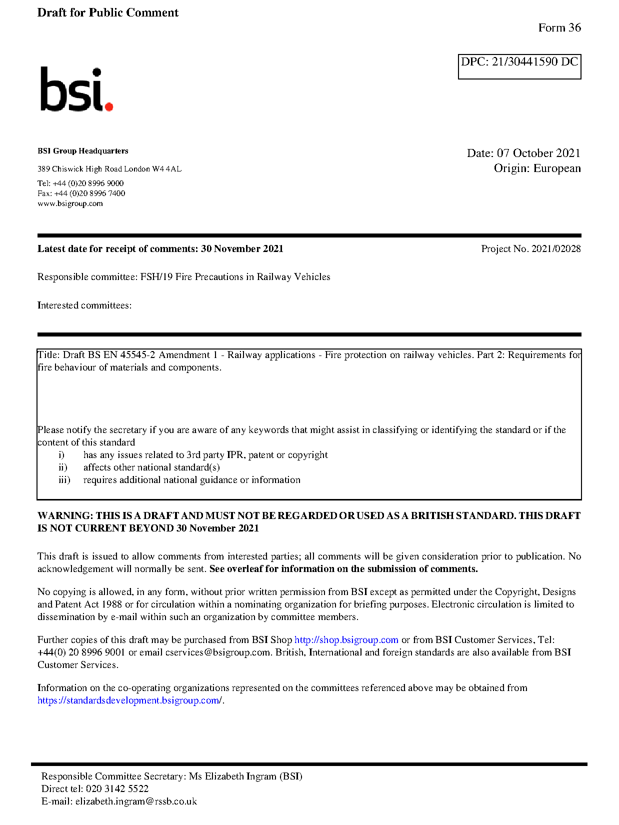 Toxic gases;Flammability;Railway vehicle components;Chair covers;Fire tests;Vehicle seating;Rail safety;Surface spread of flame;Furnishing fabrics;Railway vehicles;Fire risks;Fire resistance;Railway equipment;Fire-test classifications;Fire safety