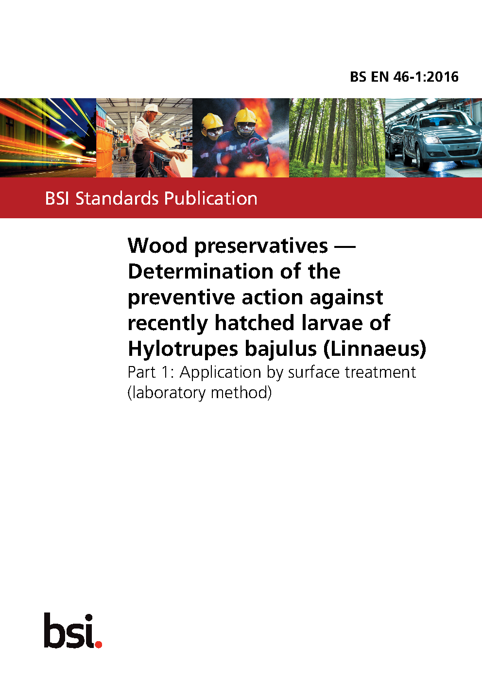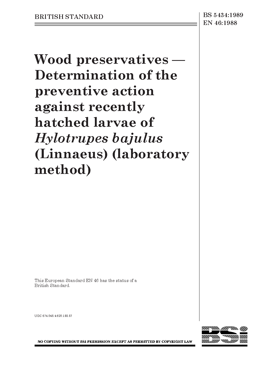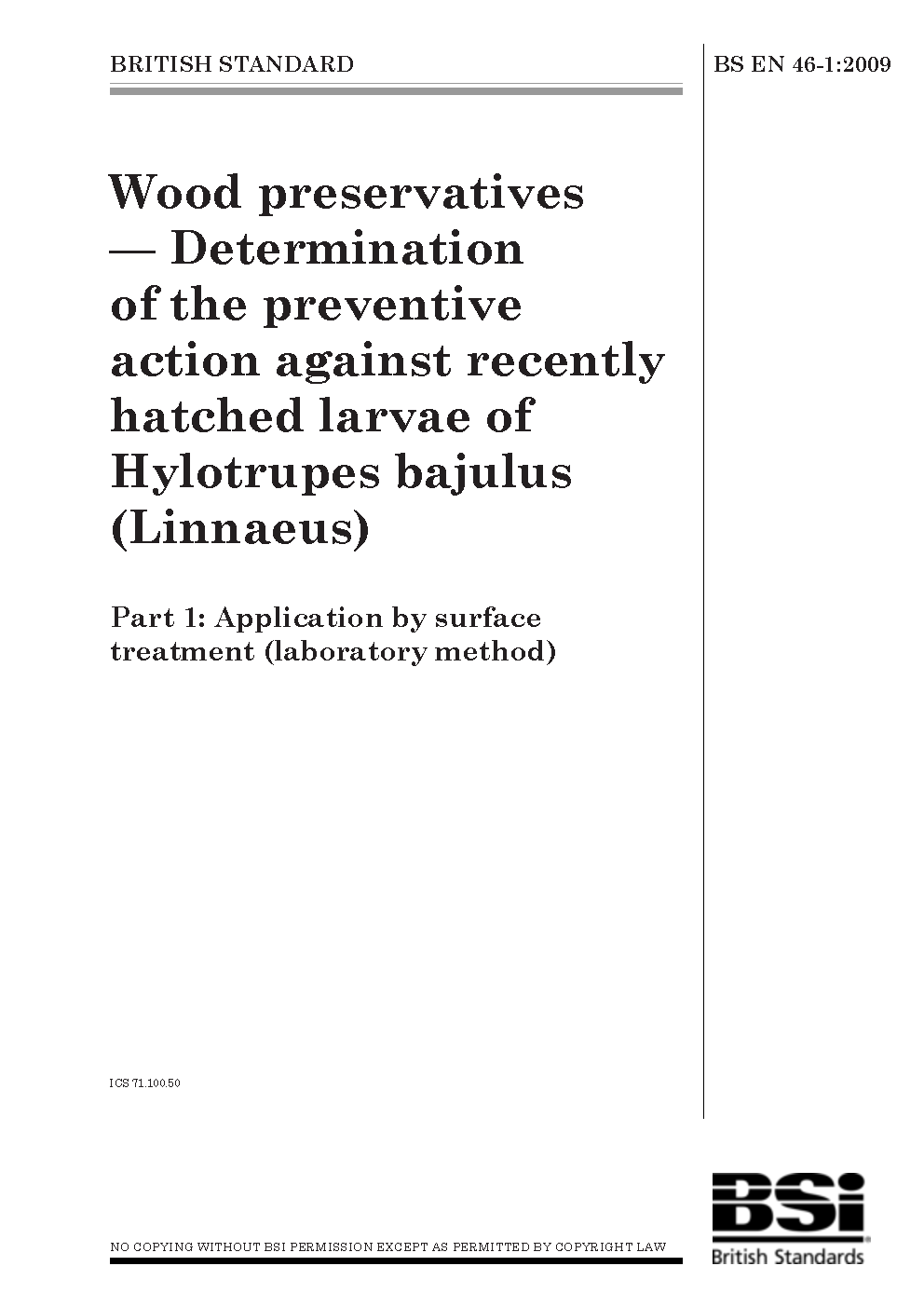 Wood preservatives. Determination of the preventive action against Hylotrupes bajalus (Linnaeus) Larvicidial effect (laboratory method)