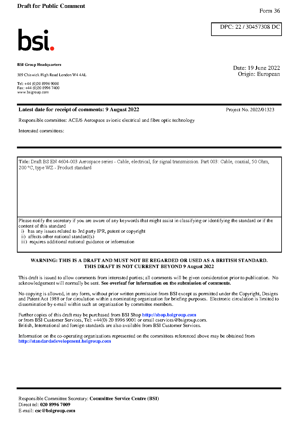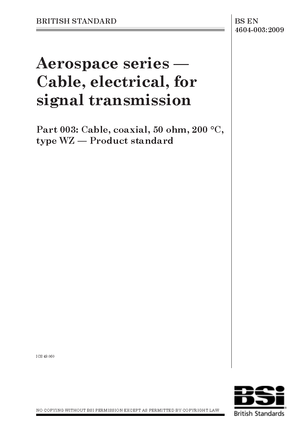 Aerospace series. Cable, electrical, for signal transmission coaxial, 50 ohms, 200 °C, type WZ. Product standard
