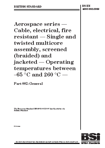 Aerospace series. Cable, electrical, fire resistant. Single and twisted multicore assembly, screened (braided) jacketed. Operating temperatures between -65°C 260°C General