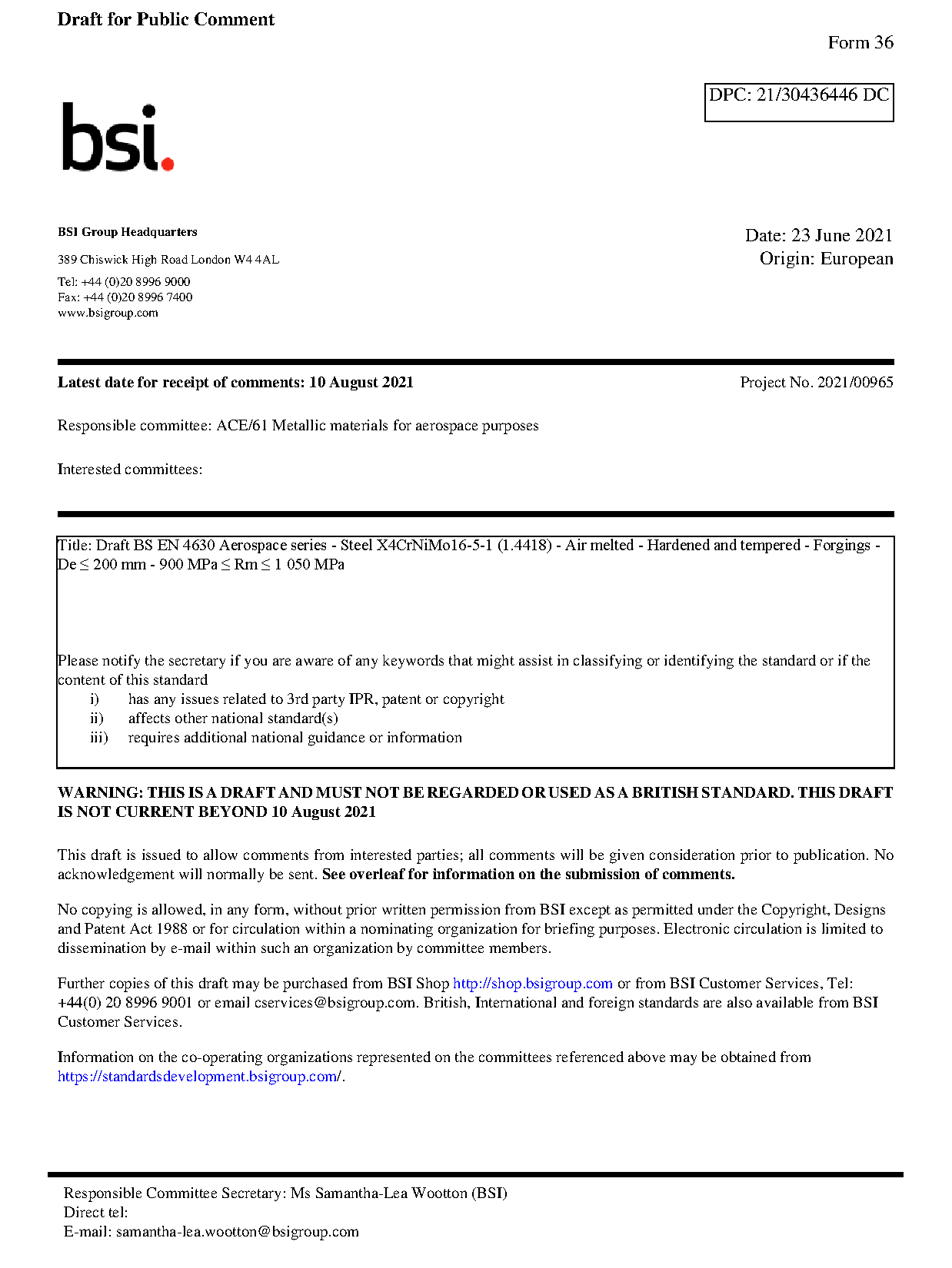 Hardening;Tensile strength;Air transport engineering;Tempering;Hardness;Proof stress;Impact strength;Forgings;Elongation;Heat treatment;Chemical composition;Grain size;Steels;Dimensions;Melting;Air