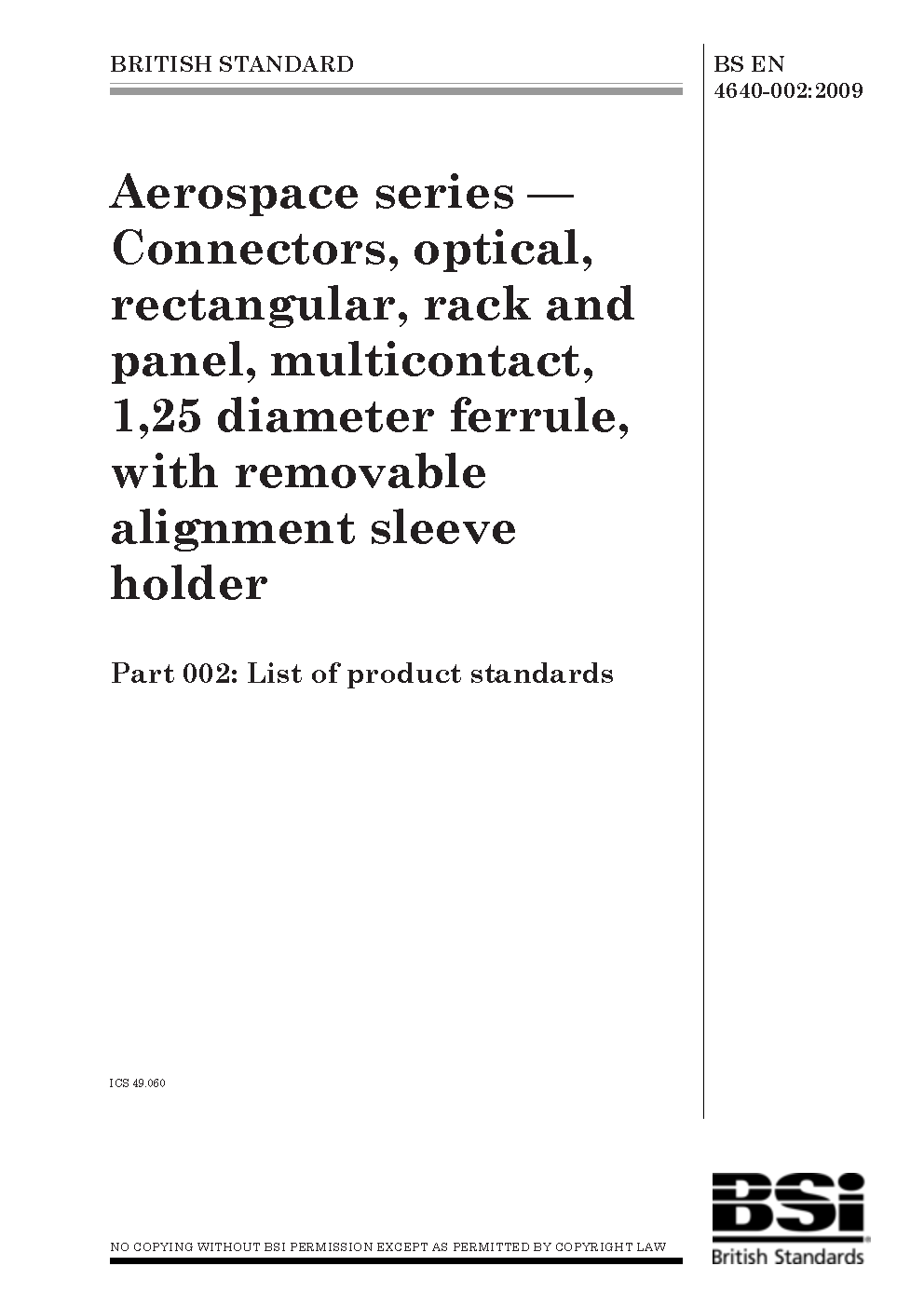 Aerospace series. Connectors, optical, rectangular, rack and panel, multicontact, 1,25 diameter ferrule, with removable alignment sleeve holder List of product standards