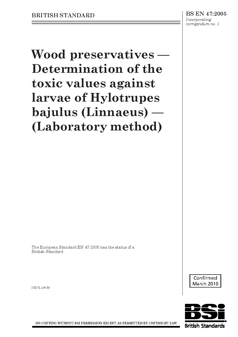 Wood preservatives. Determination of the toxic values against larvae of Hylotrupes bajulus (Linnaeus). (Laboratory method)