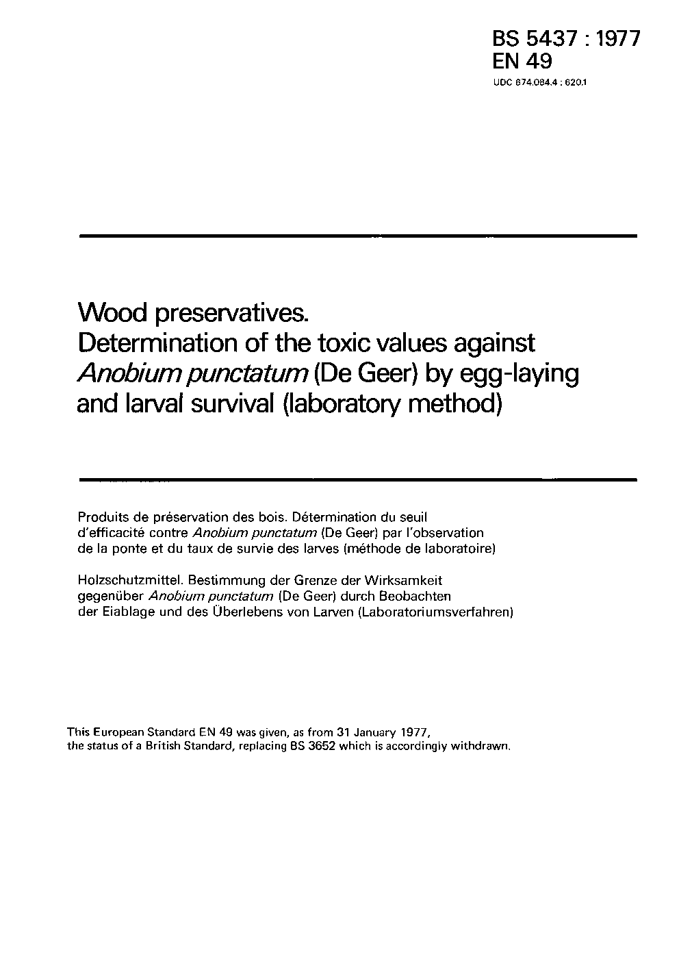 Wood preservatives. Determination of the protective effectiveness against Anobium punctatum (De Geer) by egg-laying and larval survival Application impregnation (laboratory method)