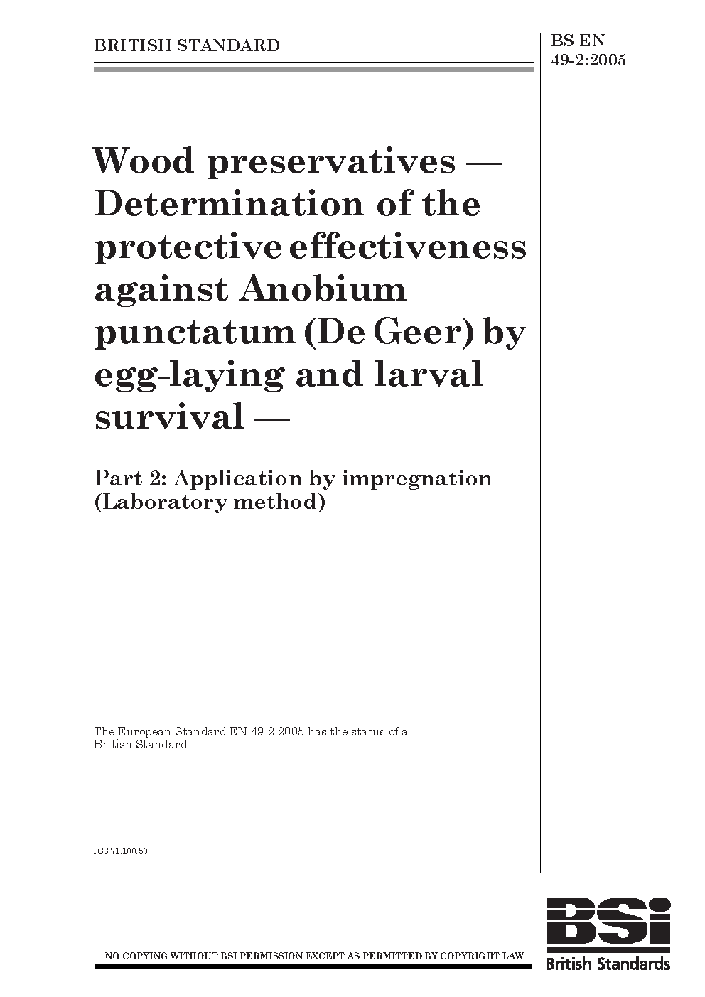 Wood preservatives. Determination of the protective effectiveness against Anobium punctatum (De Geer) by egg-laying and larval survival Application impregnation (laboratory method)