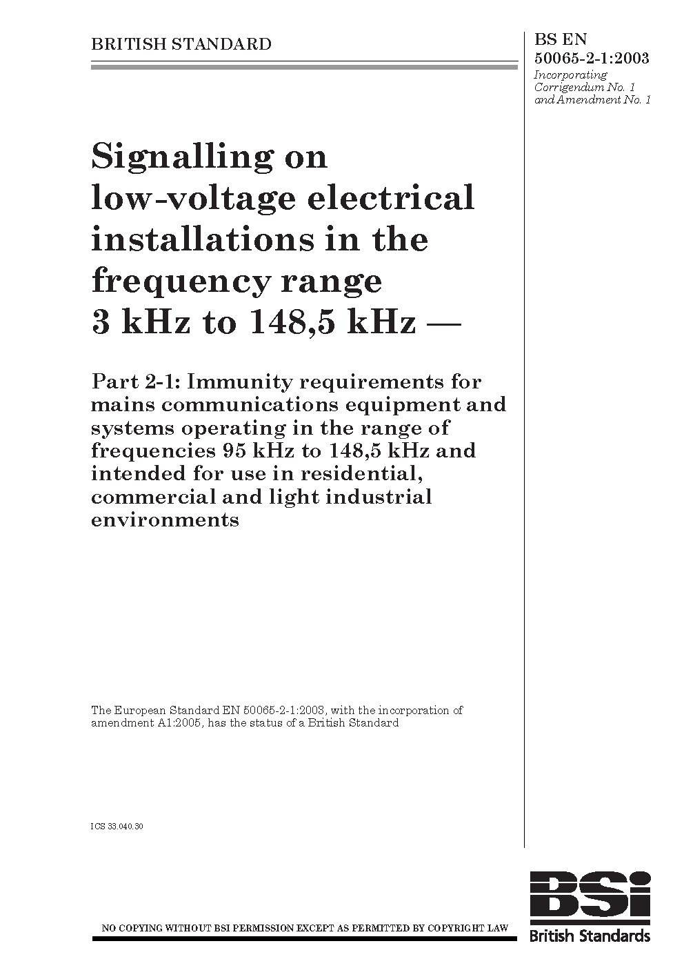 Signalling on low-voltage electrical installations in the frequency range 3 kHz to 148,5 Immunity requirements for mains communications equipment and systems operating of frequencies 95 intended use residential, commercial light industrial environments