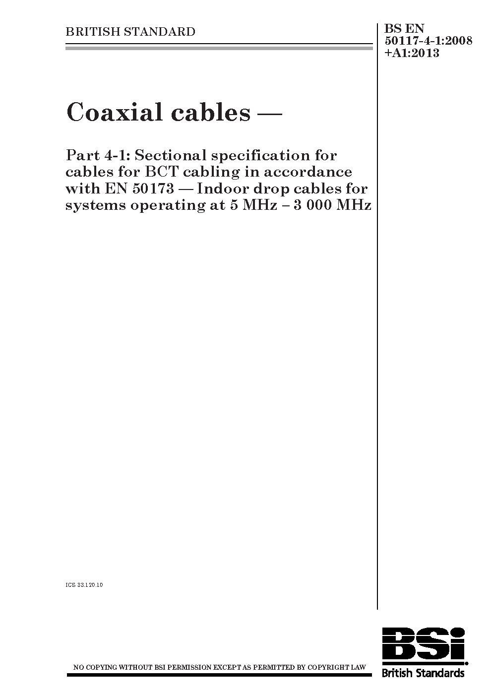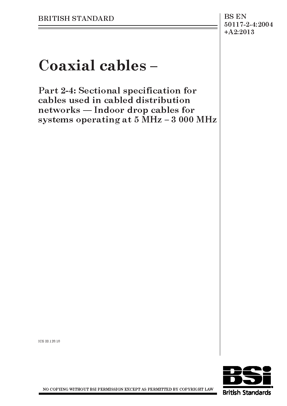 Coaxial cables Sectional specification for coaxial analogue and digital signal transmission. Indoor drop systems operating at 5 MHz - 3 000