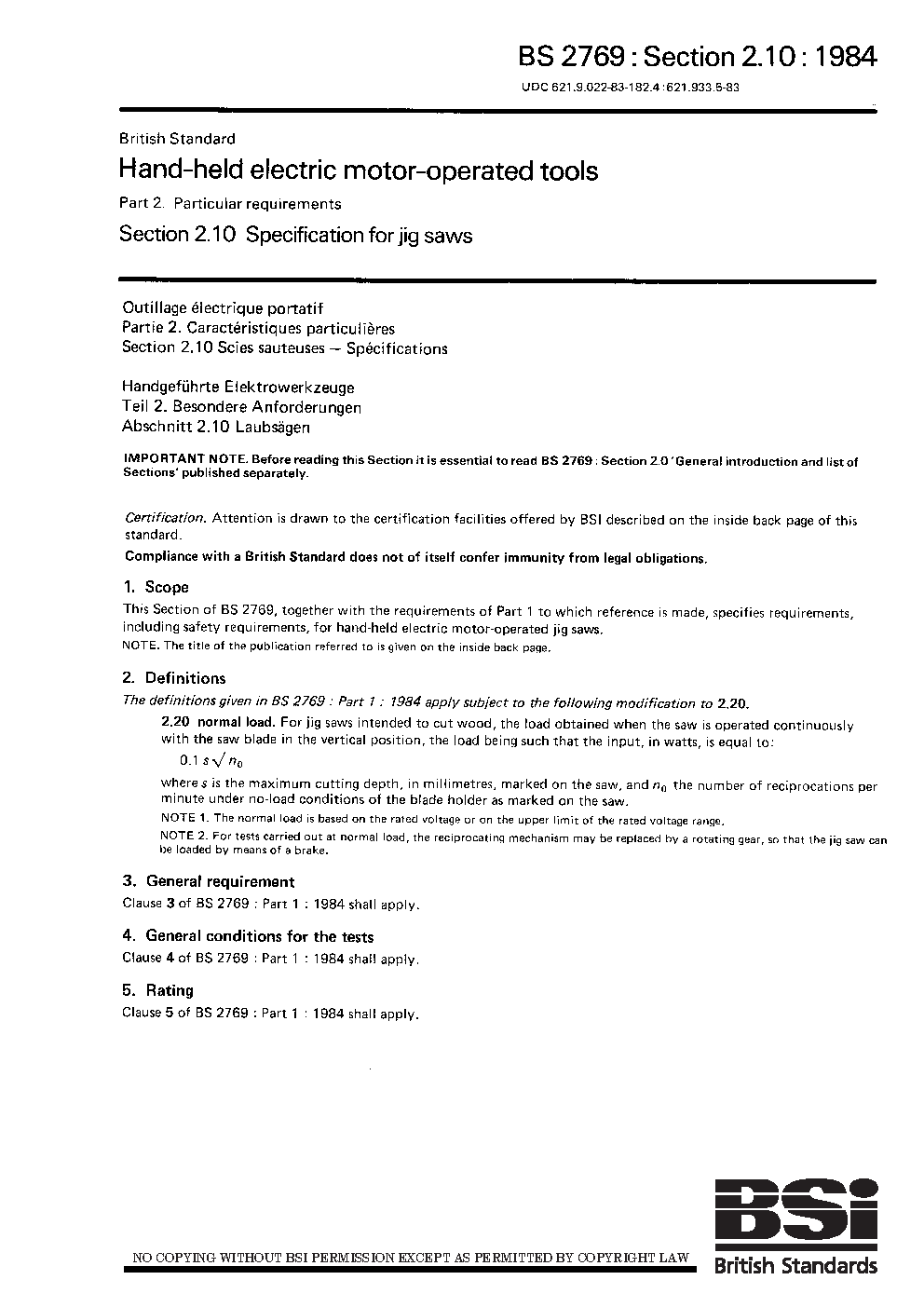 Safety of hand-held electric motor operated tools Particular requirements for jig saws