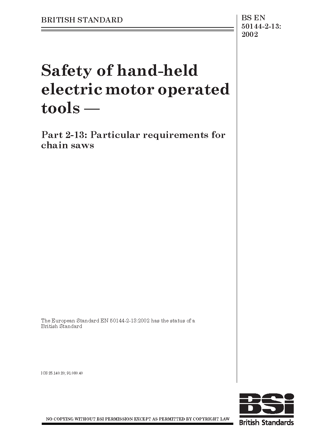 Safety of hand-held electric motor operated tools Particular requirements for chain saws