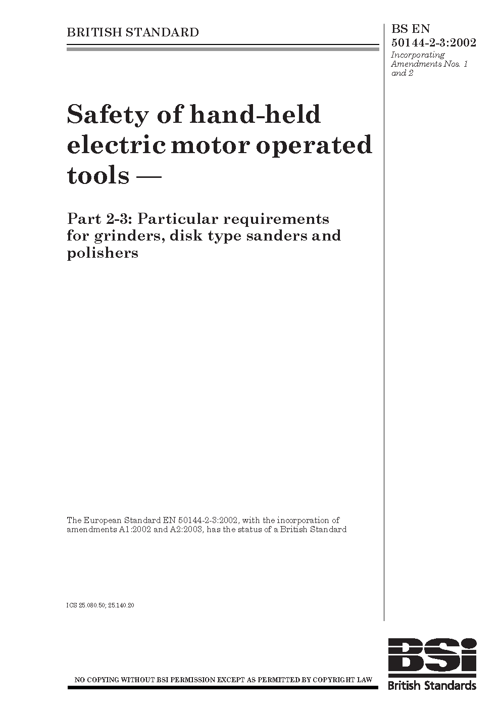 Safety of hand-held electric motor operated tools Particular requirements for grinders, disk type sanders and polishers