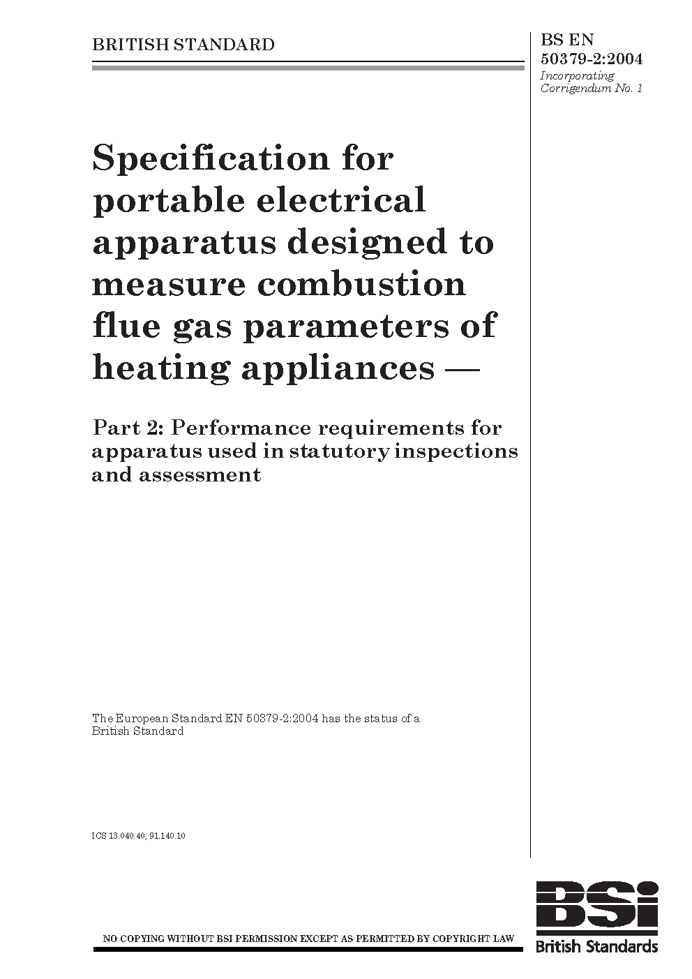 Specification for portable electrical apparatus designed to measure combustion flue gas parameters of heating appliances Performance requirements used in statutory inspections and assessment