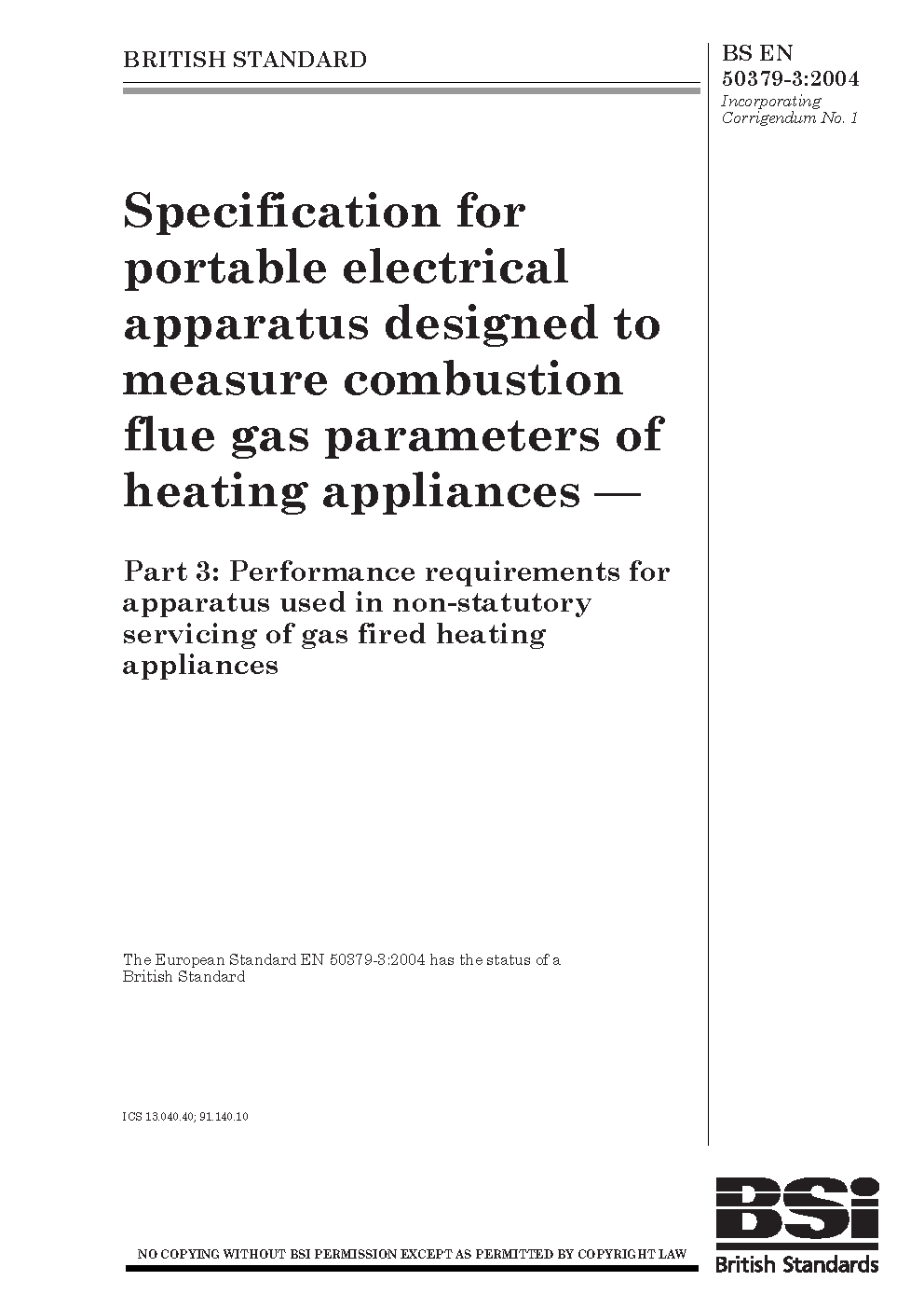 Specification for portable electrical apparatus designed to measure combustion flue gas parameters of heating appliances Performance requirements used in non-statutory servicing fired
