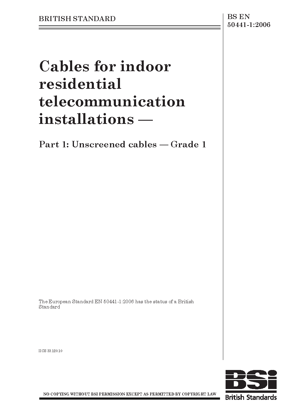 Cables for indoor residential telecommunication installations Unscreened cables. Grade 1