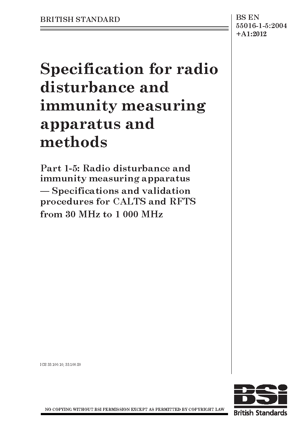 Specification for radio disturbance and immunity measuring apparatus methods Radio apparatus. Antenna calibration sites reference test 5 MHz to 18 GHz