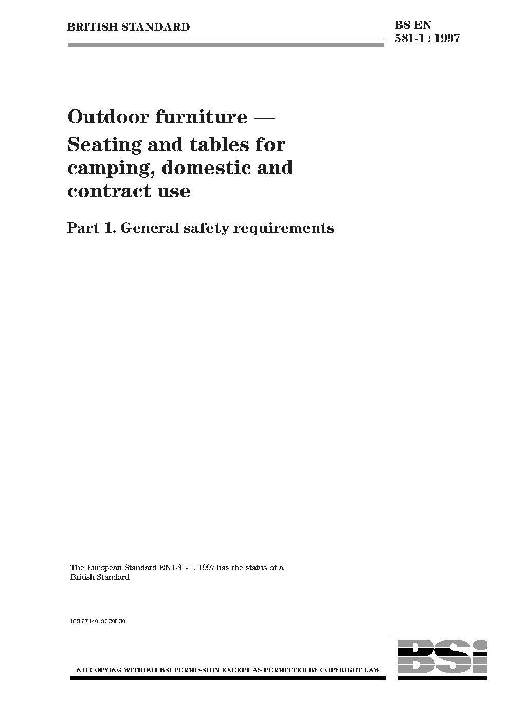 Outdoor furniture. Seating and tables for camping, domestic contract use General safety requirements