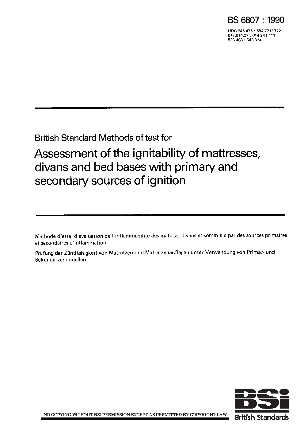 Furniture. Assessment of the ignitability mattresses and upholstered bed bases Ignition source: match flame equivalent