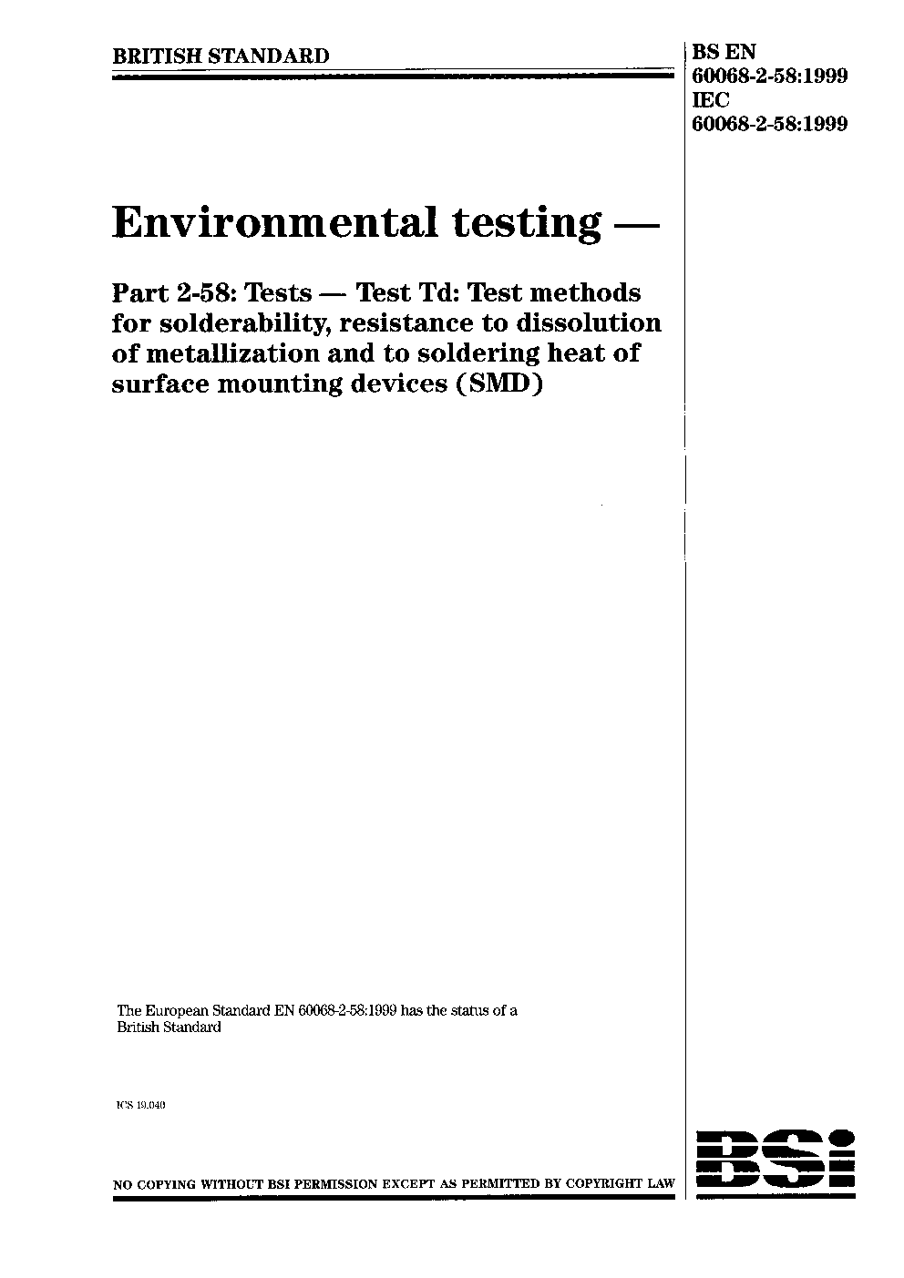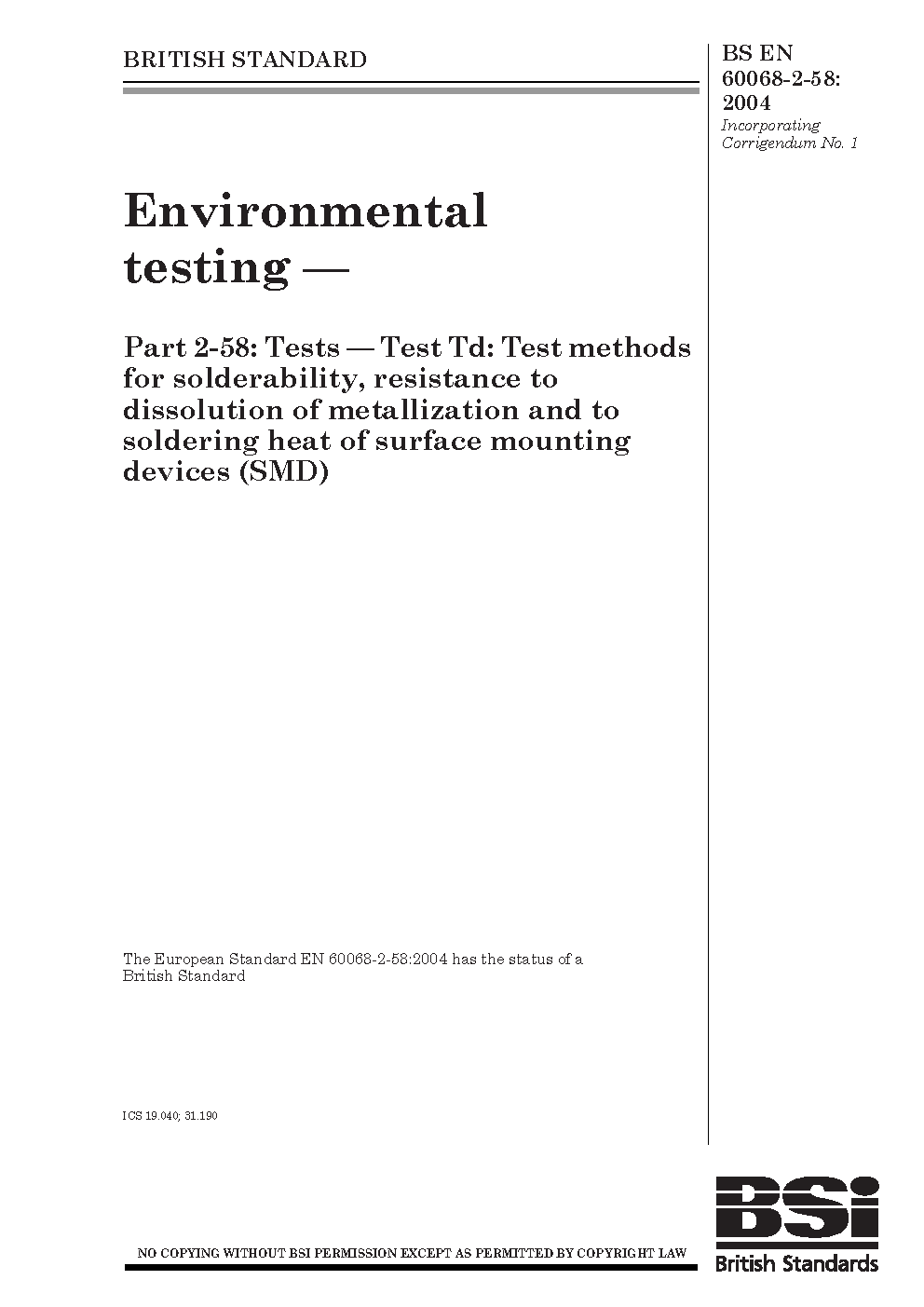 Environmental testing Tests. Test Td. methods for solderability, resistance to dissolution of metallization and soldering heat surface mounting devices (SMD)