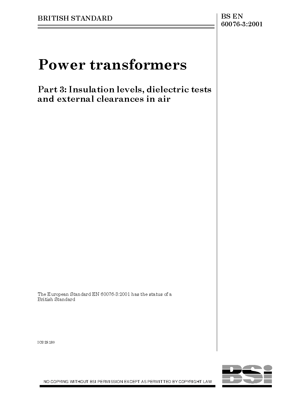 Power transformers Insulation levels, dielectric tests and external clearances in air