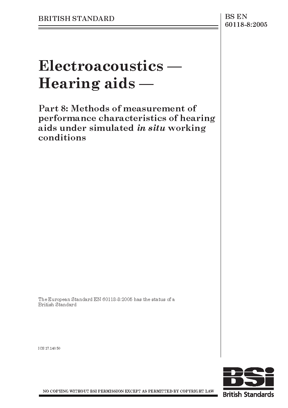 Electroacoustics. Hearing aids Methods of measurement performance characteritics hearing under simulated in situ working conditions