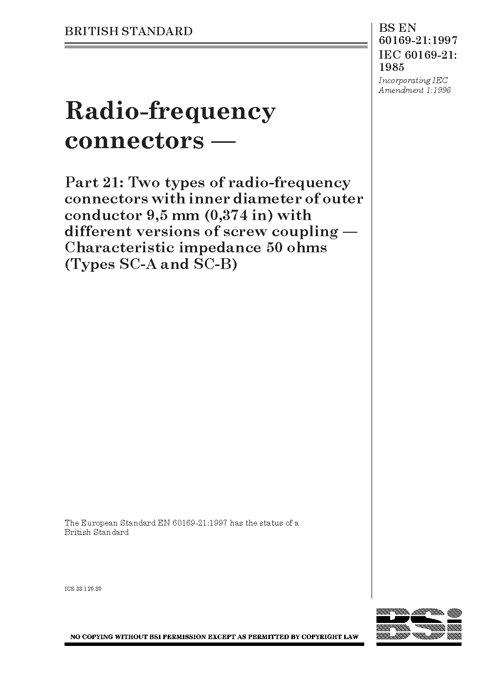 Radio-frequency connectors Two types of radio-frequency with inner diameter outer conductor 9,5 mm (0,374 in) different versions screw coupling. Characteristic impedance 50 ohms (types SC-A and SC-B)