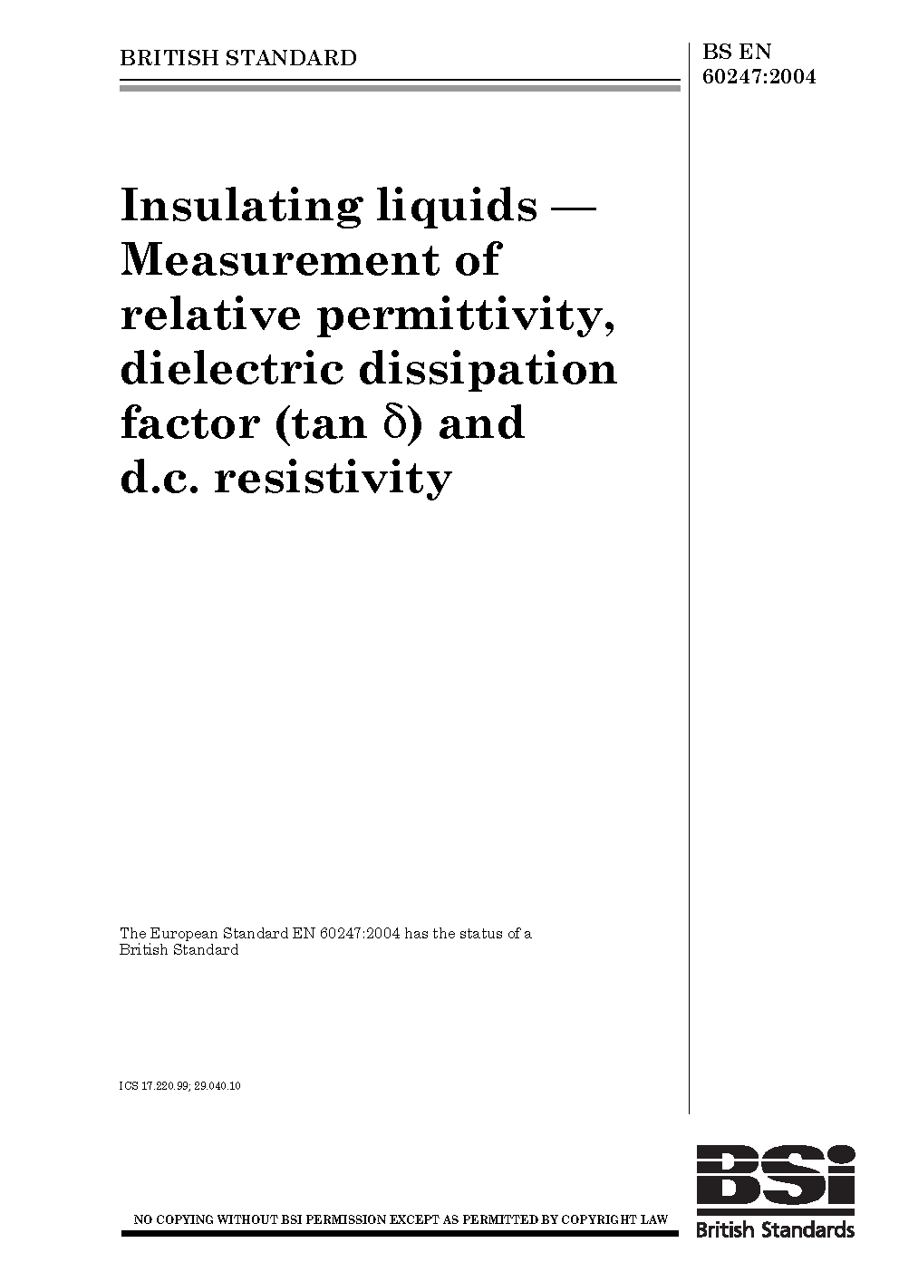 Dielectric measurement;Testing conditions;Dissipation factor;Electrical components;Liquid electrical insulating materials;Permittivity;Resistance measurement;Electric cables;Electrical resistivity;Dielectric properties;Electrical equipment;Direct current;Permittivity measurement;Transformers;Electrical testing;Electrical insulating materials