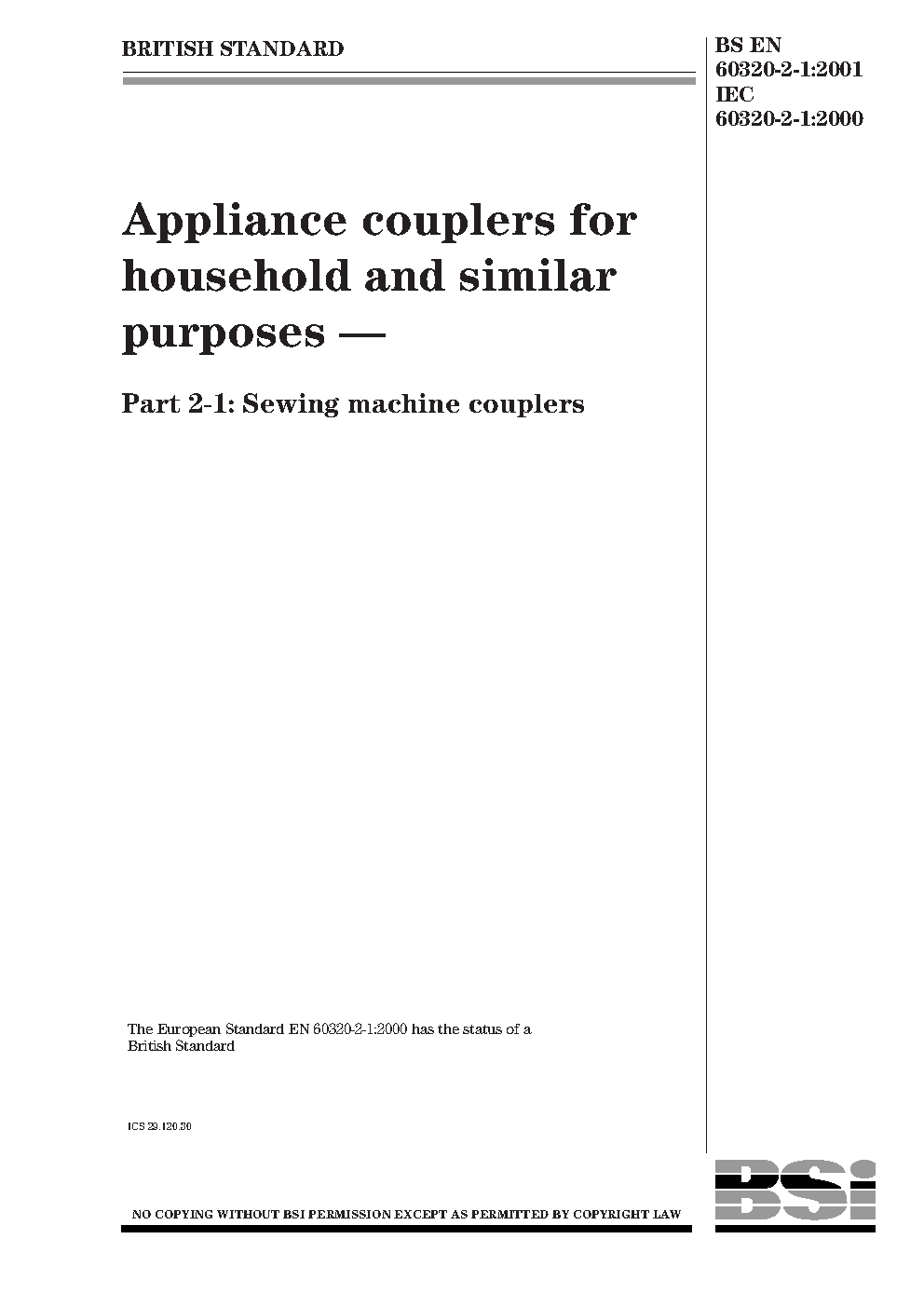 Appliance couplers for household and similar general purposes. Specification of requirements individual types coupler Sewing machine