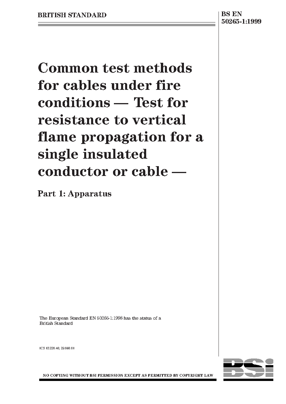 Tests on electric and optical fibre cables under fire conditions Test for vertical flame propagation a single insulated wire or cable. Apparatus