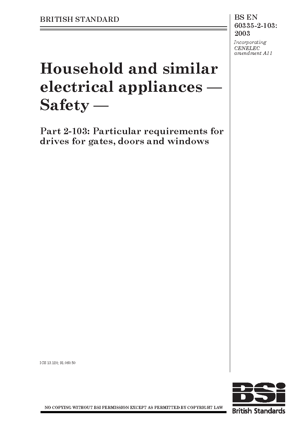 Household and similar electrical appliances. Safety Particular requirements for drives gates, doors windows